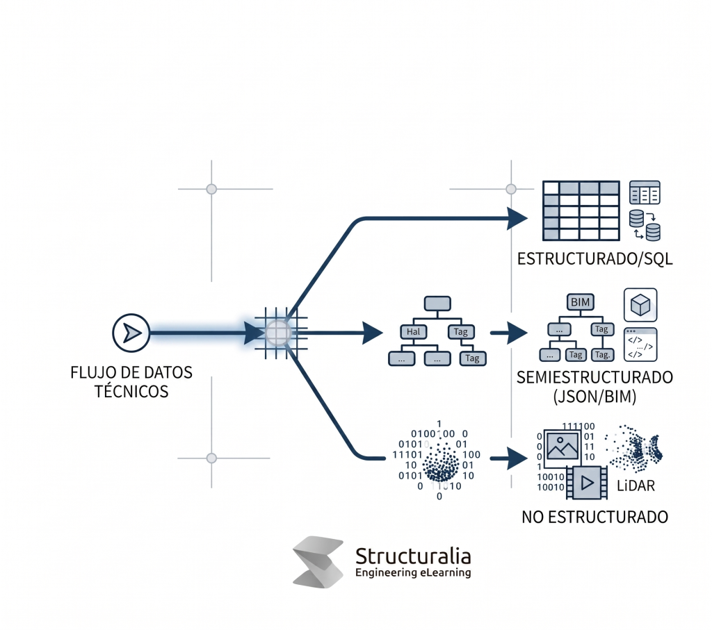 Los datasets no estructurados representan el mayor volumen de información generada en la ingeniería moderna, aunque su aprovechamiento técnico sea más complejo. Se trata de archivos binarios sin esquema definido, como nubes de puntos LiDAR (Light Detection and Ranging), vídeos de inspección o audios de campo. Para que este conjunto de datos sea útil, requiere capas de inteligencia artificial que traduzcan los píxeles o señales en variables métricas estructuradas que un ingeniero pueda interpretar.