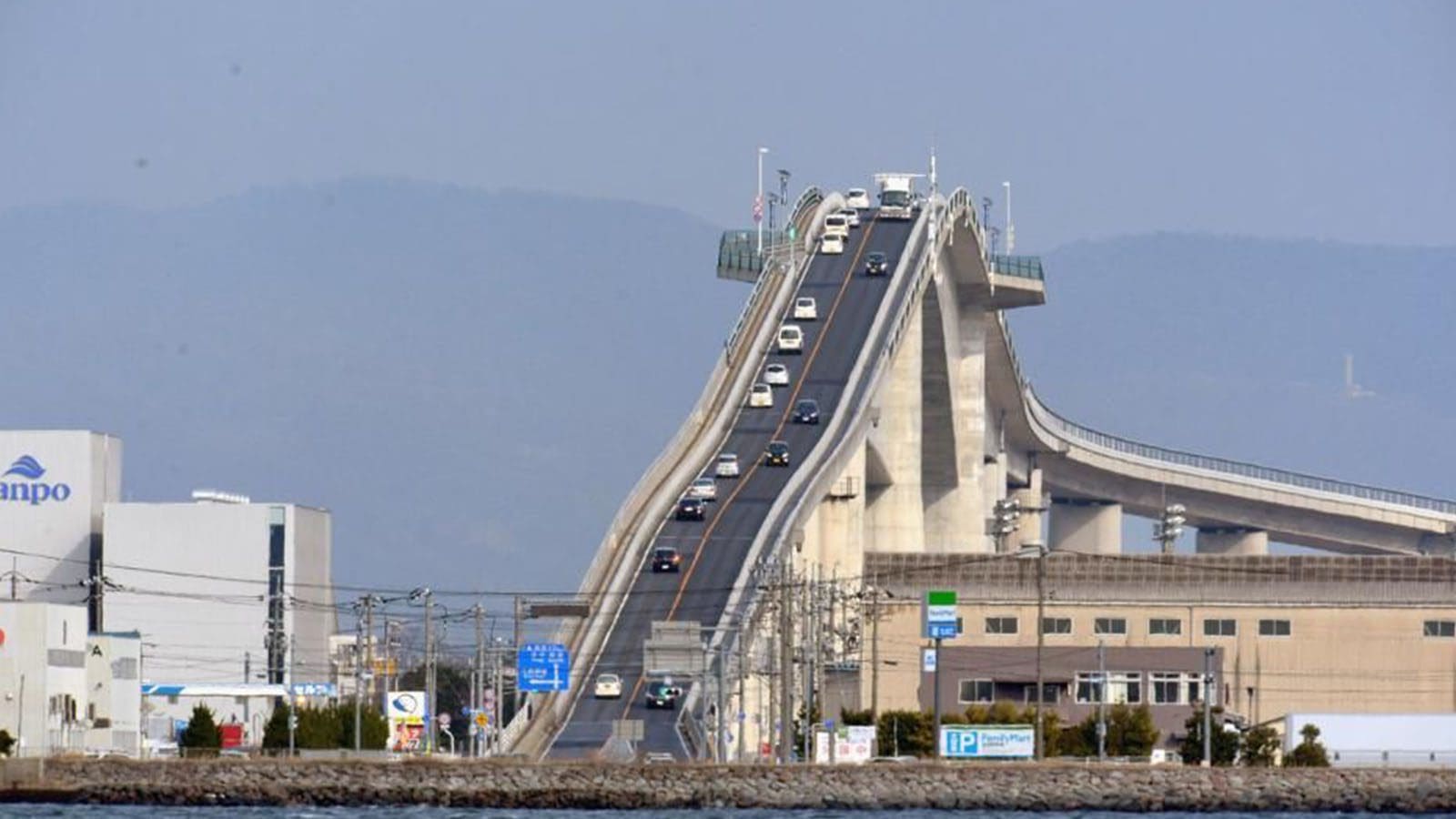 El puente Eshima Ohashi está construido sobre el lago Nakaumi, en Japón, y enlaza las ciudades de Matsue y Sakaiminato. Su gran elevación está diseñada para que sea posible el tráfico de buques por debajo de él. En la parte superior transcurre una carretera de hormigón de dos carriles, que muchos se han atrevido a comparar con una montaña rusa debido al gran cambio de rasante que se produce en su punto más alto.