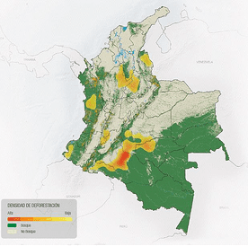 Ilustración 2: Densidad de deforestación y áreas con bosques naturales. Fuente: (Ministerio de Ambiente y Desarrollo Sostenible & IDEAM, 2019)