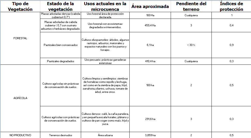 Los siguientes usos, con un factor de protección de 0,4 y 0,5, son los definidos por el uso urbano, cultivos agrícolas sin prácticas de conservación de suelos, y uso forestal con ecosistemas degradados e intervenidos, los cuales se presentan en áreas de pendiente media (entre 18% y 24%), es decir, la pendiente comprendida entre la iniciación de la erosión y la de arrastre total, y con un área correspondiente al 41,06% de la microcuenca. Estas áreas requieren igualmente una intervención, que permita ampliar la cobertura vegetal y con prácticas de conservación de suelos. Finalmente, se tiene el uso forestal por área de protección declarada y cultivos silvopastoriles: árboles, algunos rastrojos, arbustos, matorrales y espacios naturales con los pastos y forrajes, que corresponden solamente al 7,73% del área de la microcuenca y con un índice de protección de 1,0 y 0,9.