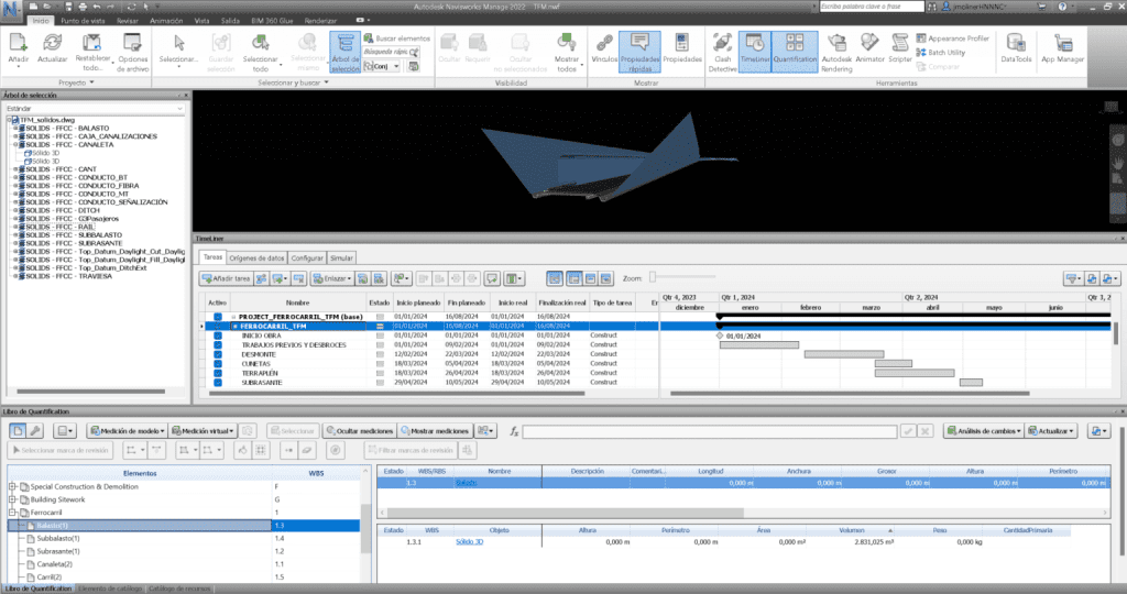 Se ha exportado toda la información generada por Civil 3D a Navisworks, y se ha generado un plan de obra asociado a cada uno de los elementos importados. Este plan de obra permite asociar cada sólido con una tarea, de manera que se puede ver el avance parcial de la obra y los sólidos en función de las tareas completadas asociadas a dichos sólidos.