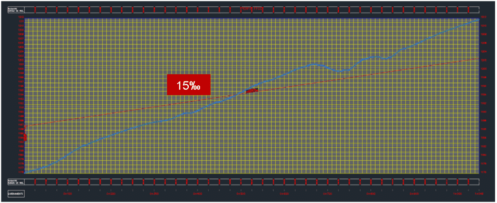 Se podría haber subido a 25 milésimas para reducir el movimiento de tierras, ya que el terreno es accidentado, pero se ha preferido mantenerlo a 15 milésimas para habilitar la operación de ambos trenes.