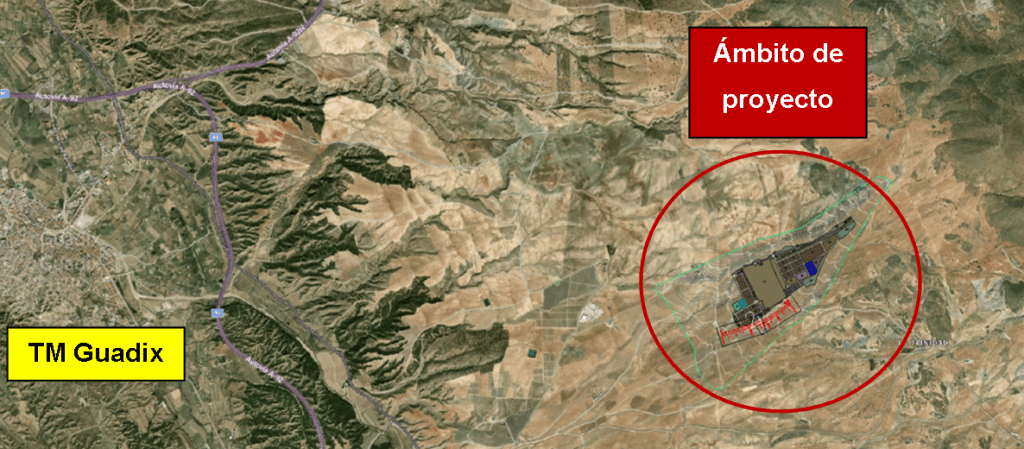 Figura 1. Ámbito de proyecto de la nueva urbanización. Se observa la A-92 en su paso por Guadix, visto en ortofoto en planta.