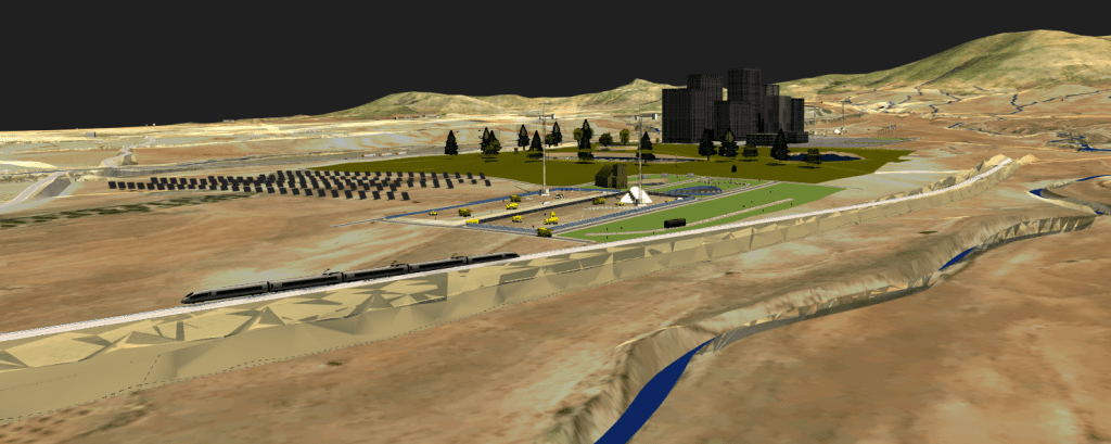 Figura 2. Ámbito de proyecto de la nueva urbanización. En primer plano, la línea de ferrocarril proyectada y al fondo, el libramiento carretero, todo modelado en Infraworks.