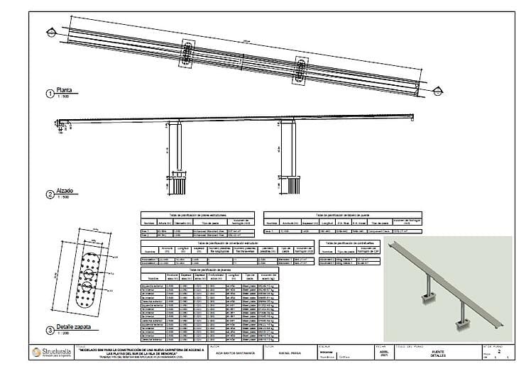 Por su parte, el puente se exportó desde Infraworks a Structural Bridge Design (v.2020) para analizar la compatibilidad entre ambos softwares desde el cual se podría llevar a cabo el análisis estructural del mismo. A su vez, se empleó Revit (v.2021) para crear planos de detalle y tablas de planificación de los elementos que componen el puente.