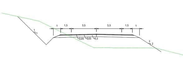 Respecto a la sección tipo, se modificó la importada desde Infraworks para ajustarla a la sección mostrada en la Imagen 5 y así poder crear las distintas capas de firme y ajustar los taludes de desmonte y terraplén a los deseados. En Civil 3D, para realizar el diseño de la Sección Tipo de una obra lineal se crea primero un objeto de ensamblaje al que se le añaden objetos de subensamblaje que una vez configurados permiten el diseño de las secciones tipo deseadas. La sección tipo empleada en este trabajo está compuesta de los siguientes subensamblajes: Carriles 🡪 “LanersuperelevationAOR”, Arcenes y bermas 🡪 “ShoulderExtendAll”, Taludes 🡪 “BasicSideSlopeCutDitch”.