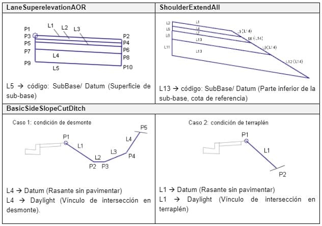 Se ha diseñado una obra lineal formada por varias líneas base y se ha creado la intersección de los taludes con la superficie al seleccionar la superficie “terreno natural” como objetivo en el cuadro de diálogo de crear obra lineal. Para crear la superficie de la obra modificada, se ha tenido en cuenta que se va a empezar a ejecutar el paquete de firmes del proyecto a partir del terreno natural cortado por la última capa de nuestro paquete de firmes, por tanto, se ha creado una superficie con el código de esa línea que en nuestro caso es “datum” y coincide para todos los subensamblajes. Por último, se añadió el contorno exterior con el que la obra lineal interseca con el terreno natural indicando el código del subensamblaje de los taludes que en este caso era “intersección”.