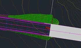 - Se aisló la región de transición y se extrajeron, de esta zona, las líneas características que interesaban, es decir, las líneas que recorren la subbase de la obra lineal en los laterales y el estribo, para a partir de ellas realizar la explanación.